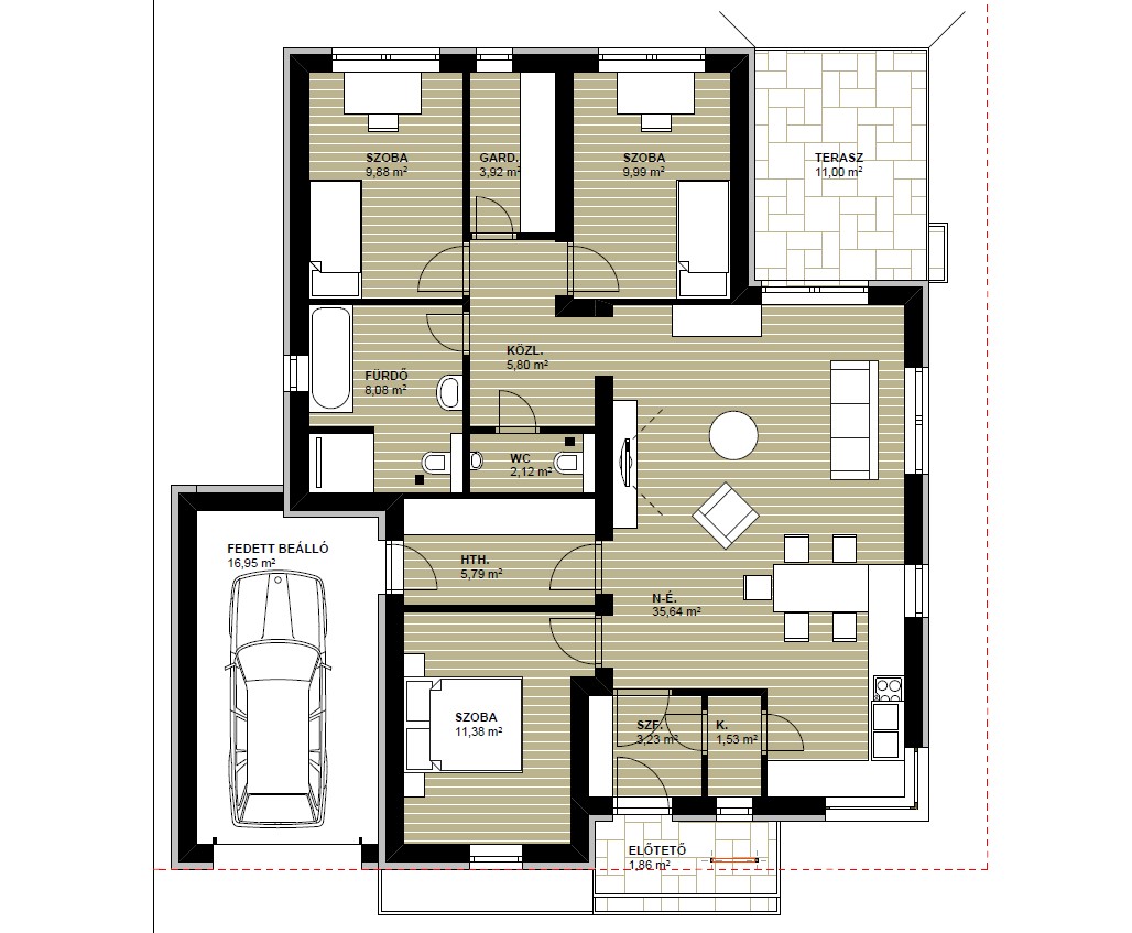 90,26 m² + 13,88 m² terasz + 5,31 m² fedett belépő