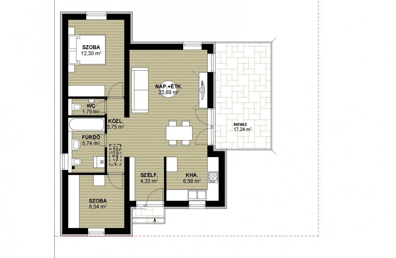 82 m² + 17,24 m² terasz + 1,19 m² fedett belépő